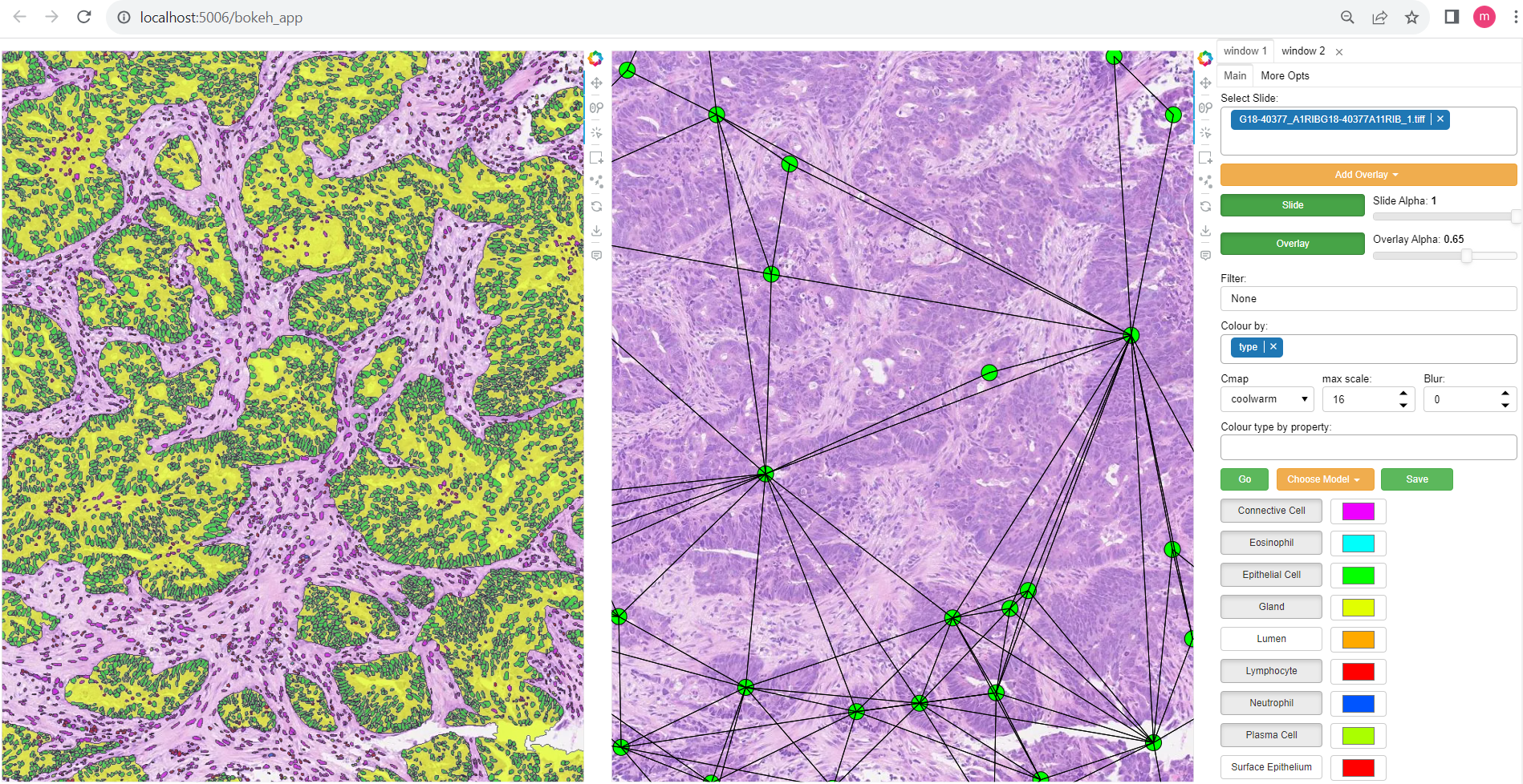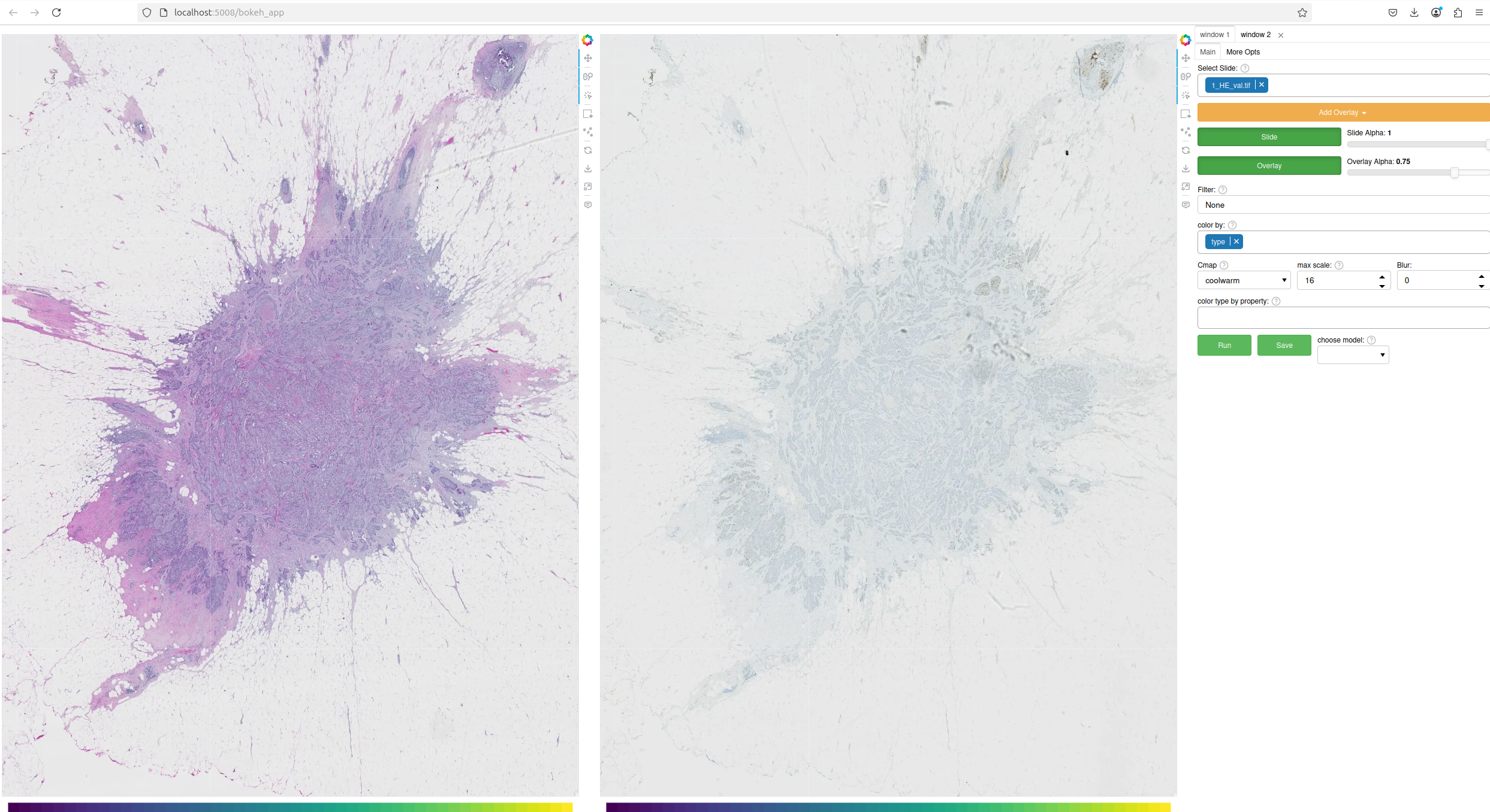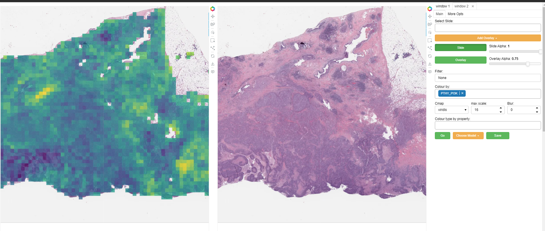 A second window can be opened by selecting the ‘window 2’ tab in the top right. This will open the currently selected slide in a second window as illustrated above. The overlay shown in each window can be controlled independently to allow comparison of different overlays, or viewing of a model output side-by-side with the raw image (slide), or ground truth annotations. Slide navigation will be linked between both windows. Two different slides can also be opened in the two windows, although this will only be useful in cases where the two slides are registered so that a shared coordinate space/slide navigation makes sense.