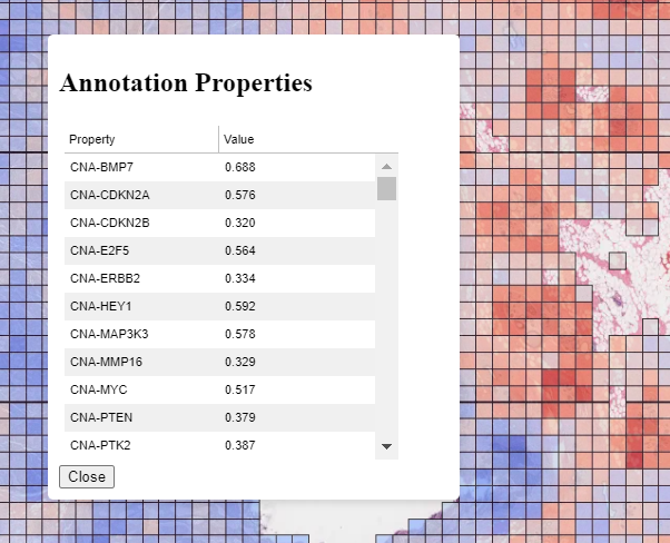 Annotations can be inspected by double-clicking on them. This will open a popup showing the annotation in more detail, and allowing the properties to be viewed in a sortable table. An example can be seen to the right for a patch prediction overlay where multiple targets have been predicted for each patch.