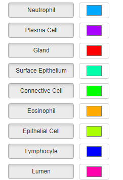 Once you have selected a slide with the slide dropdown, you can add overlays by repeatedly choosing files containing overlays from the overlay drop menu. They will be overlaid on the slide as separate layers. In the case of segmentations, if your segmentations have the ‘type’ property as one of their properties, this can additionally be used to show/hide annotations of that specific type. Colors can be individually selected for each type if the randomly generated color scheme is not suitable.